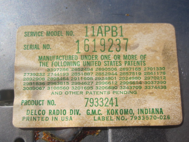 Selling a Delco AM radio that was taken out of an original 71 Malibu. Not sure if it works or not but its the cleanest one I've seen in quite awhile. Has the tag with 11APB1 and part number 7933241 as shown in photo. The dial moves freely with the knobs and buttons. Someone wrote there name on it with a sharpie. Asking price is 100 shipped to lower 48 USA. Larry 520-349-2337