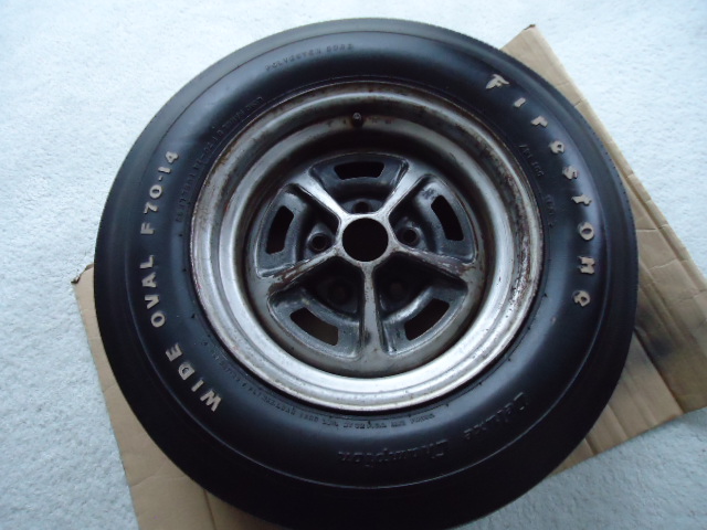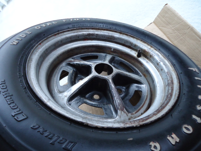 This is the Deluxe Champion small script white letter version with size callout that was only available during 1969,and has never been reproduced.The 1970 larger letter version is being reproduced.Tread is still good & deep,but there is some dry rot on the back sidewall of it,so I recommend displaying this in your trunk as a spare etc,and not to drive on it.Has the correct small Dill valve stem and the rim is date coded YA April 29th,1969 as well. I'm driving through Ohio in a few weeks & can bring this along if it helps anyone. Nice original wheel. $700 RedL78@ATT.NET |