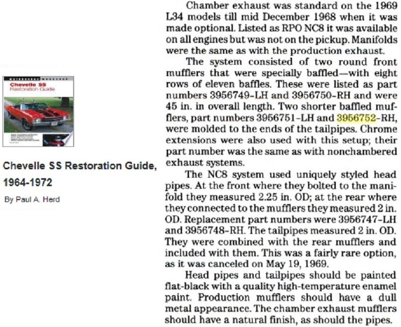 GM Part # 3956752. See photos for condition as this is New Old Stock. This tail pipe is designed to fit the Chambered Exhaust system in 1969 but will also work for a factory 1970 Chevelle Big Block car. Tail pipe also has the original dealer order slip which is in a Pink bag stuck on the side of the pipe. (See Photo for close up). Also read the write up on the 1969 exhaust system from a Chevelle book on the last photo. Paypal "Gift or Friends & Family" Payment required within 24 hours after "I Will Take It" is mentioned. Shipping $40 lower 48 States. Tailpipe/Resonator $350 A Danny Donald Tarquini Consignment