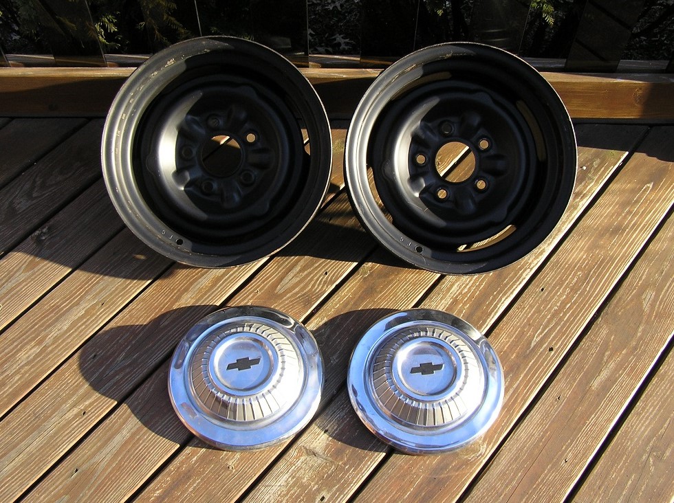Excellent pair of 14x6 FC coded wheels and two driver quality 67 dog dish caps. These wheels are clean and straight. Hardly any rust and perfect in condition. No dents or curb rash anywhere. There is no date code near the valve stem. There is a date code on the edge where a full size wheel cover would attach to. My research tells me that these wheels are produced by Norris Technologies. There is a NT stamping on one of the webs next to the lug nut holes. These would be perfect for a 67 Camaro SS which had no date code next to valve stem. Any questions please email. $160.00 plus shipping. I'll need your full address for a FedEx shipping quote. Paypal F and F,check/mo. Jim,413-262-3345.