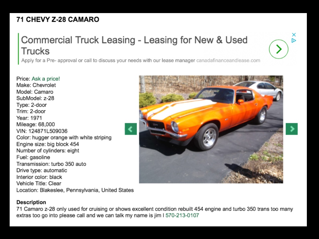 Subject VIN 124871L509036 Seller's nose must be growing as 05/16 the car wasn't anything 'special' when Jim in PA advertised it on eBay & elsewhere... https://www.ebay.com/itm/-/282031737...2047675.l10137 This recent ad for the car includes the below 454 description, different than the eBay ad also quite the word-smithing. ![]() http://topclassiccarsforsale.com/che...maro-z-28.html ![]() ~ Pete ============================== 1971 Chevrolet Z - 28 Custom YES.....A REAL Z-28 !! CUSTOM ORDERED FROM THE FACTORY WITH A 454 BIG BLOCK. We've never found records of another one ever leaving the factory with a 454 BBC in it. Custom Paint - hugger orange with white racing stripes, Custom Hood with reverse cowl induction. Custom 3-speed automatic racing transmission, (you got to go from Park to 1st gear before it will even start to move - and then HANG ON!!) Numbers matching - 100% original as far as all our research can determine. Call for additional details at 951 377 0386 and we can discuss further. Being sold "as-is" and "where-is", no warranties expressed or implied. Listed for sale locally and I reserve the right to end auction at any time. If you have less than 50 positive feedbacks (as a Buyer) then I reserve the right to automatically cancel your bid.....tired of tire kickers and people who don't follow through with purchases !! On Apr-29-18 at 10:35:45 PDT, seller added the following information: OK, a couple of folks have asked for the VIN, as eBay won't let you enter a 13-digit number, only a 17 digit number, so here ya' go VIN# 124871L509036 1= Manufacturer - Chevrolet24 = Series - Camaro V-887 = Body Type - 2 dr. Coupe 1 = Year - 1971L = Plant - Los Angeles / Van Nuys509036 = Sequential Series (can also be broken down to the date car left plant) in this case February 1971 ============================== .