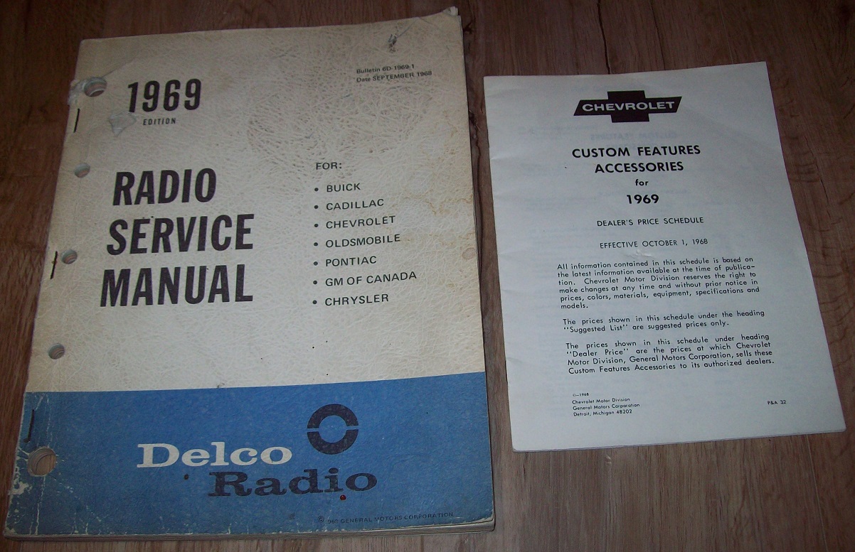 -1969 Delco Radio Service Manual for Buick Cadillac Chevrolet Oldsmobile Pontiac GM Of Canada Chrysler, covers service for every Radio and 8 Track players with all kinds of service info on how to bench test, install, remove etc... Large fold outs many pages. Very Good shape with cover wear. $30 plus $15 Shipping.