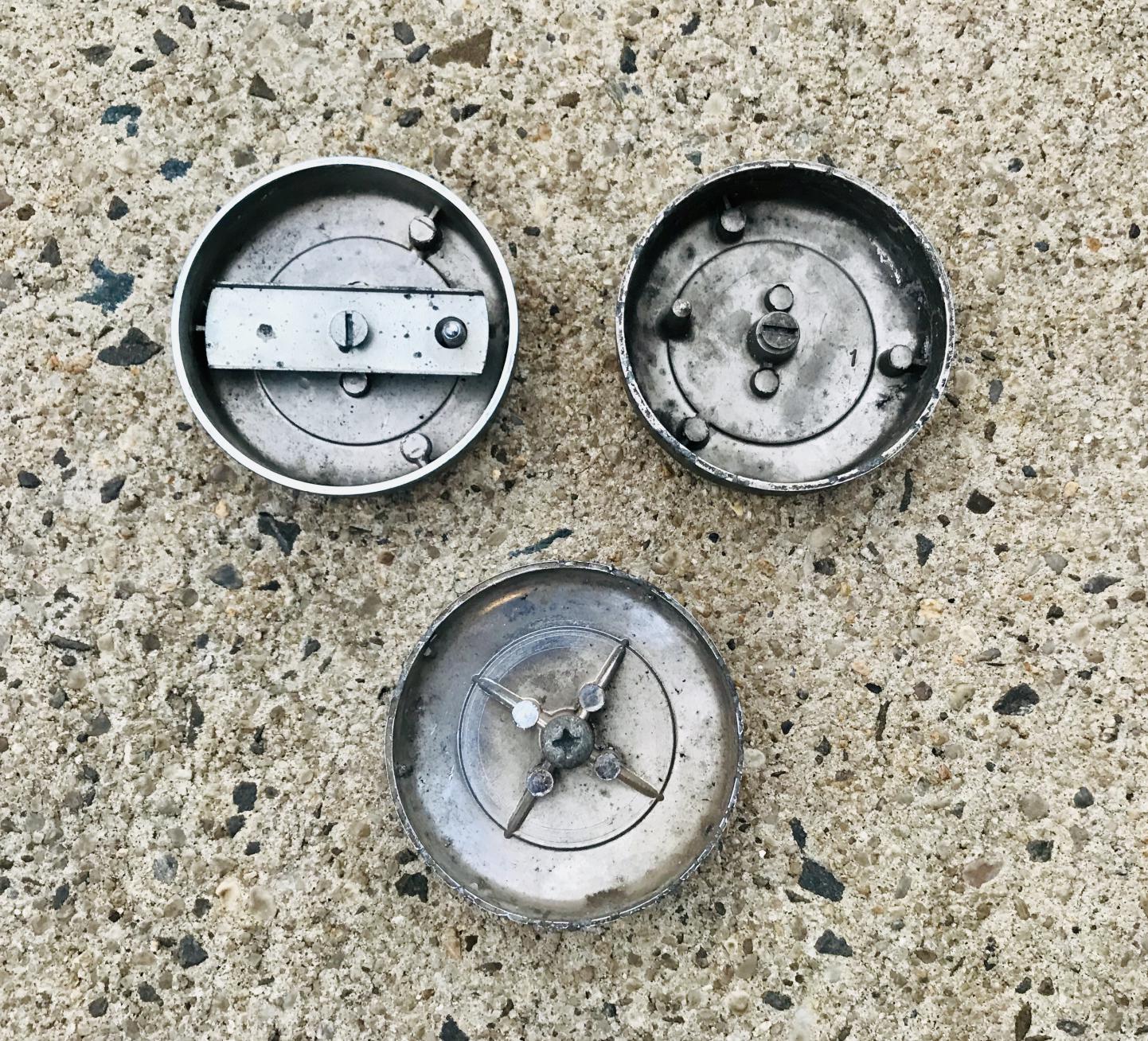 The cragar caps may clean up with some elbow grease, one of them is a non-R. The rocket cap needs to be rechromed but is worth saving. (SOLD)