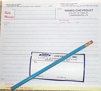 Has ìYenko Chevrolet Canonsburg Paî printed in gold colored letters The sheet is a blank ìreply messageî form with ì from Yenko Chevrolet 573-575 West Pike St Canonsburg, Paî printed on it. Makes 3 copies using carbon paper. Mailing label is a stick on printed with ì Yenko Chevrolet, Inc. PO Box 136, 960 Washington Road, Rt 19, McMurry, Pa. As pictured $55.00 |