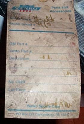 New never used original thin cardboard card printed with blue/red Yenko crest and ìParts and Accessoriesî with fields for model year GM part number and Yenko part number bottom printed ìYenko Sports Carsî PO Box 277 Canonsburg Pa. Has tin metal wire to tie on to parts. Comes with Mailing label printed with ì Yenko Chevrolet, Inc. PO Box 136, 960 Washington Road, Rt 19, McMurry, Pa. $30.00