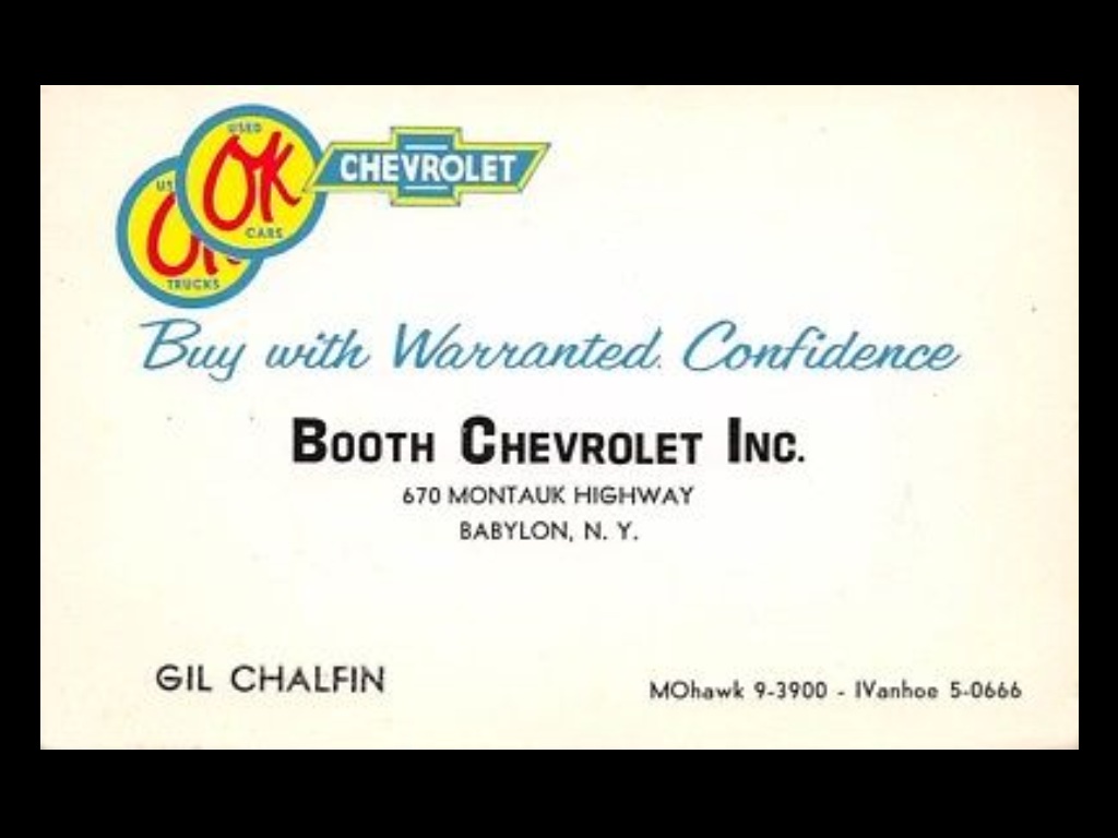 Best of luck w/ your search! [img]<<GRAEMLIN_URL>>/beers.gif[/img] ~ Pete ======================= Zone # <span style="text-decoration: underline"><span style="font-weight: bold">27</span></span> Dealer Code # <span style="text-decoration: underline"><span style="font-weight: bold">55</span></span> <span style="font-weight: bold">Booth Chevrolet</span> 670 W Montauk Hwy. West Babylon, NY 11704 (In operation 1954-1992?) ======================= ![]() >> <span style="font-weight: bold">Booth Chevrolet Babylon Emblem</span> << -