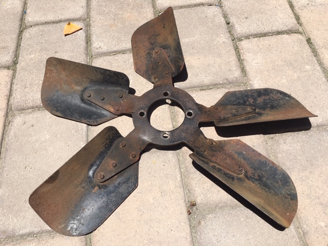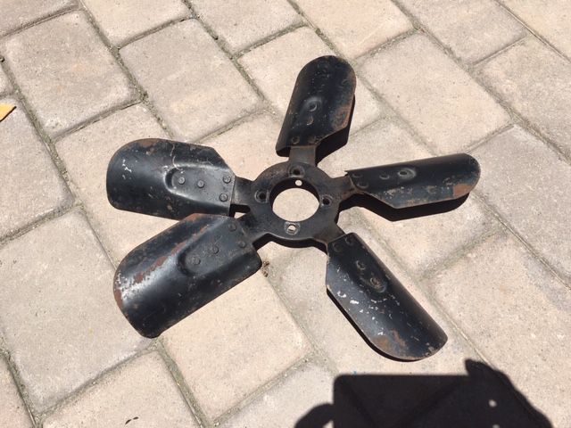 Used with HD cooling and A/C cars, 1966 and 1967. Nice original condition, surface rust but never bent or repaired. 3 inch bolt circle.