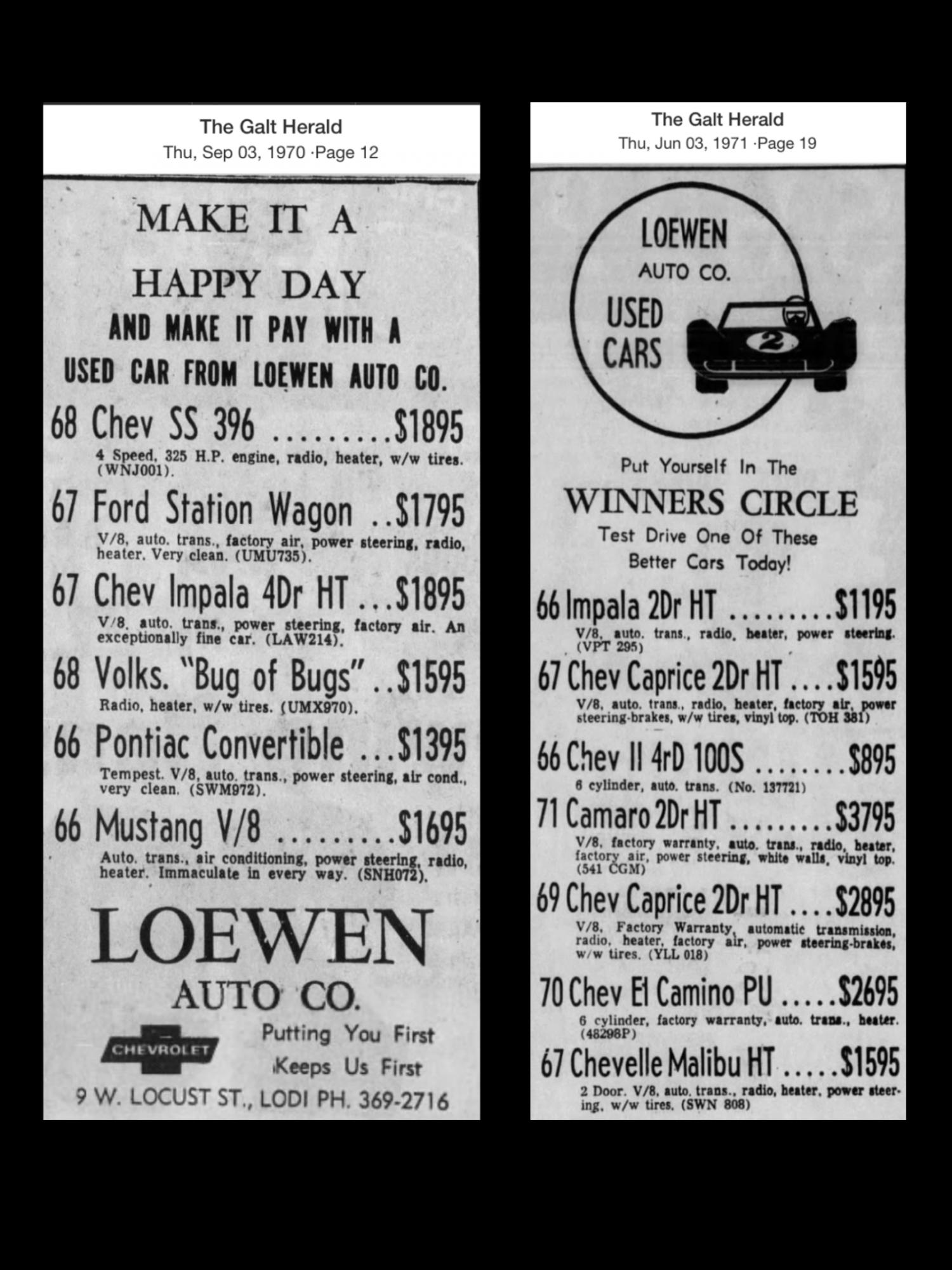 Some Loewen Delivered cars are known including ‘69 L78 Pacer ‘Vert 124679L529136 that was on BAT last year as this link, perhaps one of your guy’s cars? https://bringatrailer.com/listing/19...et-camaro-317/ Further below is a 70’ish Dealer pic plus a few old Newspaper Ads from early 20’s to early 70’s, note CA Plate #’s also VIN’s in some of the ads. ![]() ~ Pete .