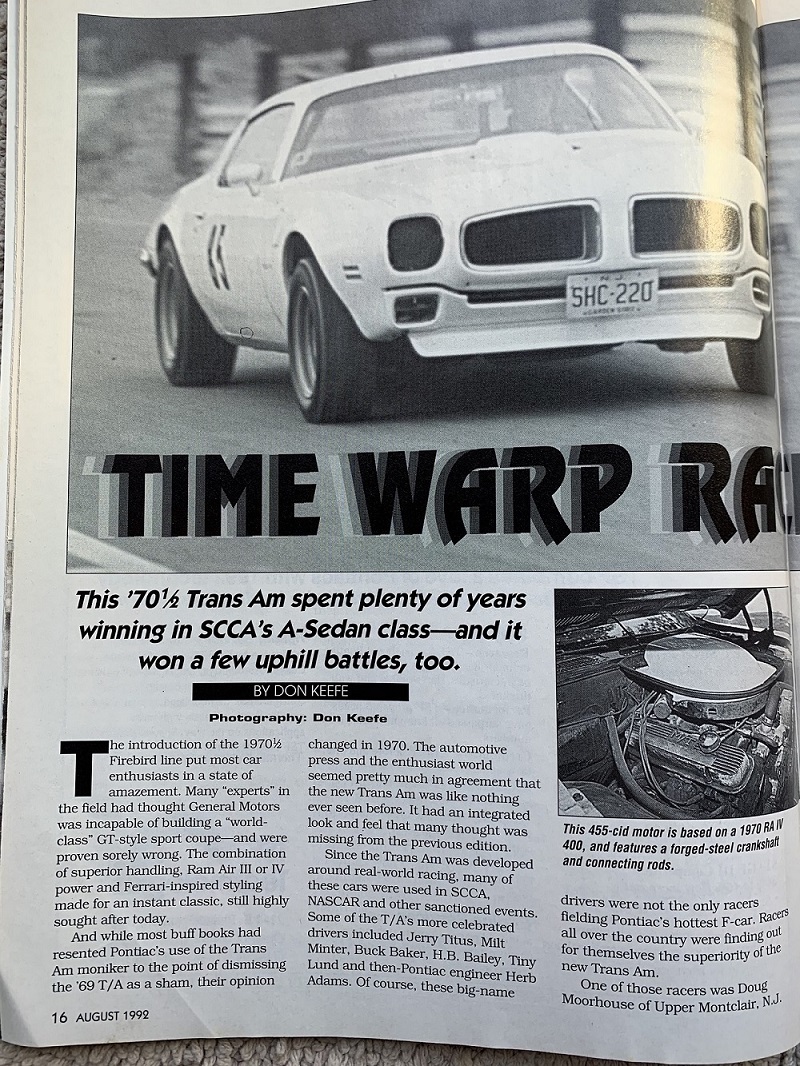 https://forums.maxperformanceinc.com/forums I remember the 1992 article. Thats about it. 70 TA is my favorite car and its cool that this one was campaigned. There are some SCCA type folks on the PY Forum 70-73 TA/Bird section is the best bet for starters. Good Luck to you Pontiac gave one of the SCCA Officials a new 1972 TA - special painted Red. It was never raced, and rarely even driven. Still exists in excellent condition |