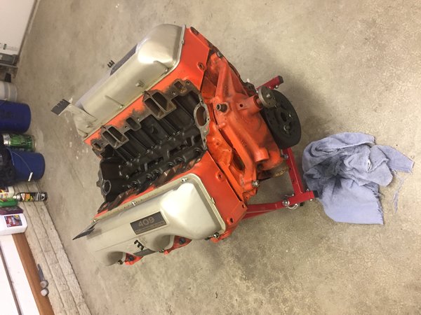 1963 409 long block. 3830814 casting, dated 340th day of 1962. TOI2IQG stamp on pad (340 HP), VIN not visible, Hydraulic cam. Hi performance 3814690 heads dated 346 and 351. Dripper valve covers. Includes 8755797 water pump dated 02858. Took out to install a date code correct assembly. Ran fine when removed. Located in north central IL. 815/985-3664 or [email protected] 881 intake available for $375 additional.