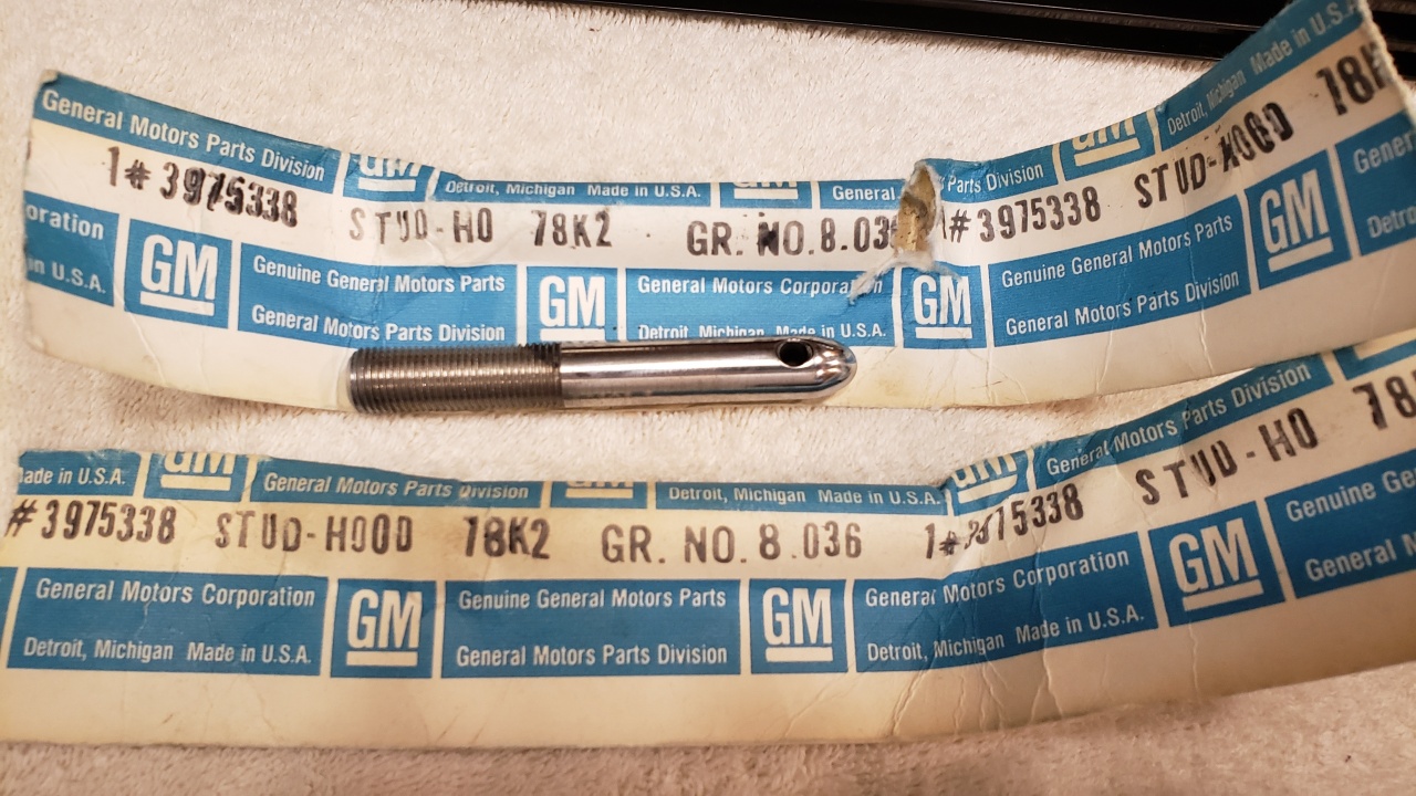 - 3975338, Stainless cowl induction hood pins, very hard to come by, in original packing, one package is opened. These are the threaded pins that attach to the radiator support. (SOLD)