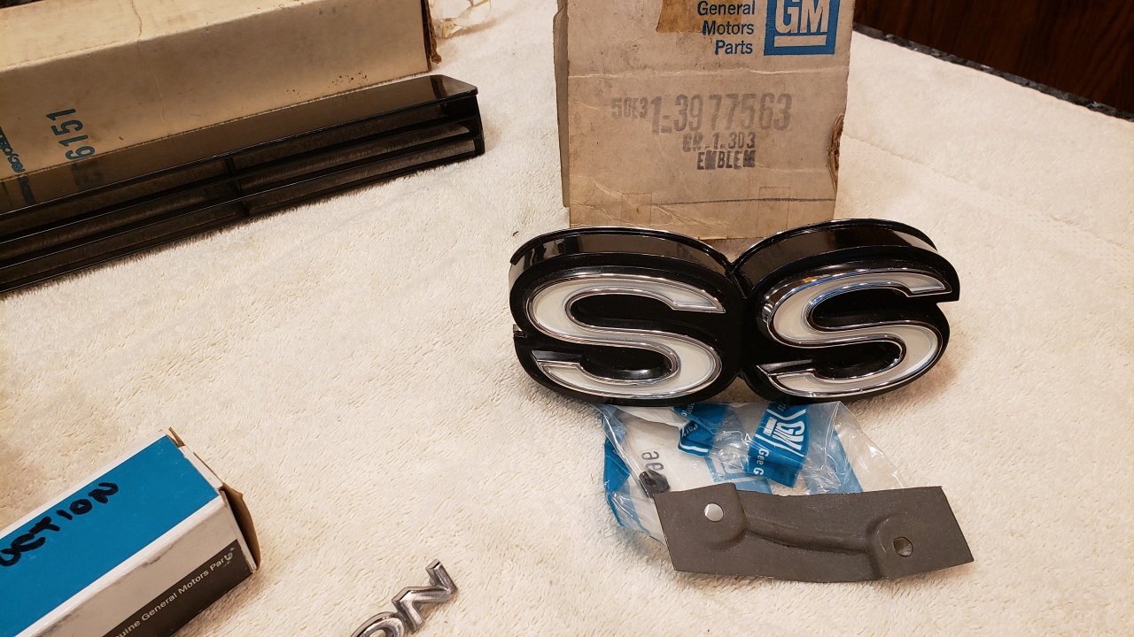 - 3977563, 1970 Chevelle SS grille emblem with backing plate and retaining nuts in box, opened original box. (SOLD)