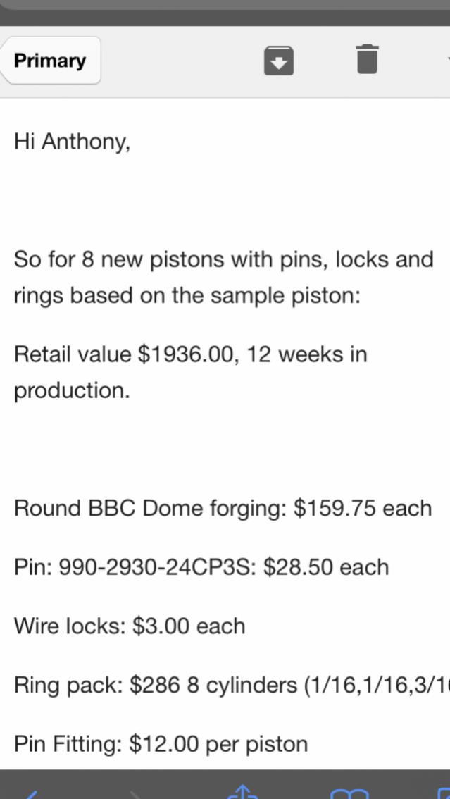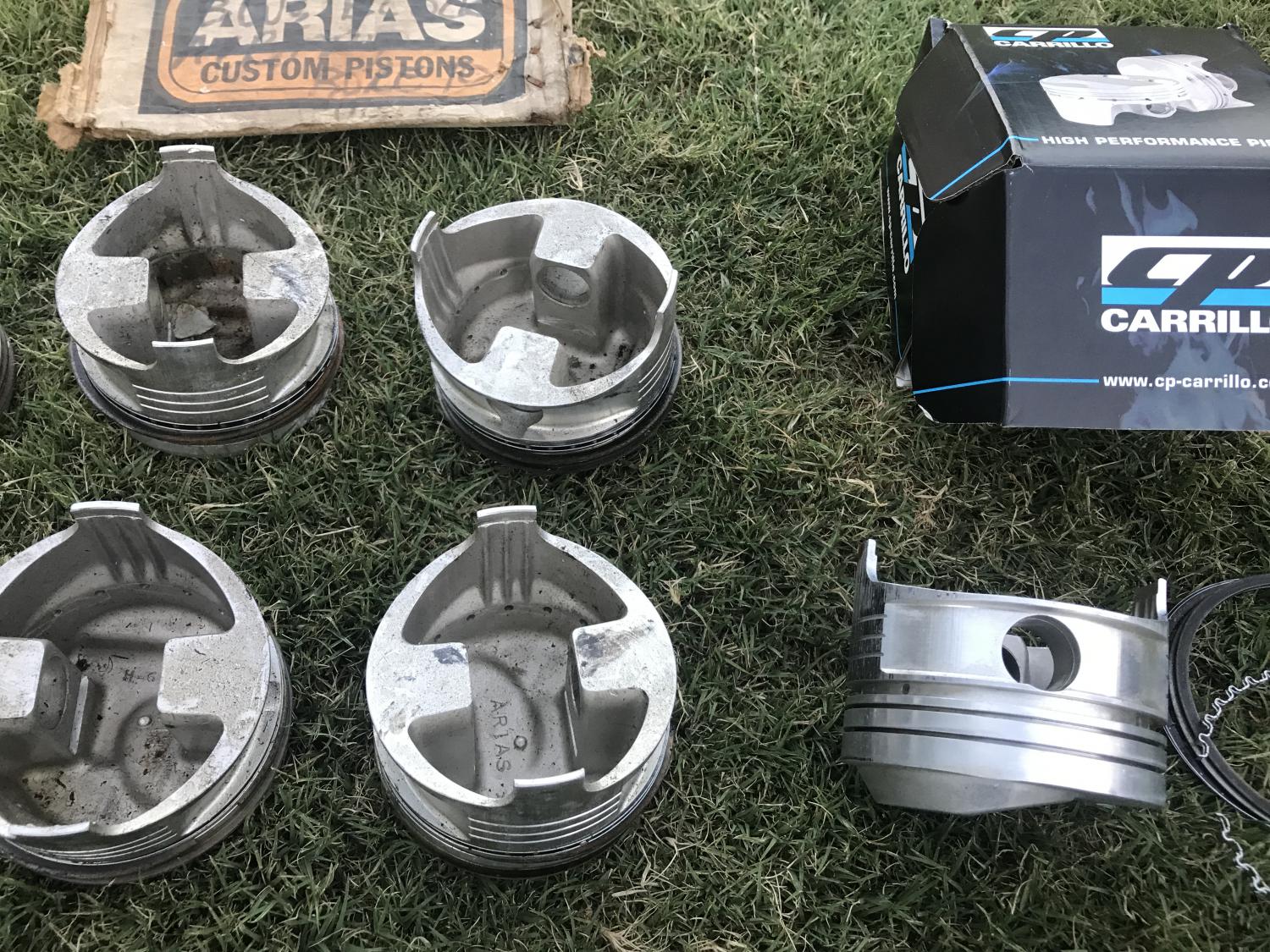 So, Arias is now CP-Carillo and they're local to me and after some pressing, I found out that they offer a service to confirm specs of any of their pistons - they reverse engineer them and give you all specifications. After they advised what I had (you can see the one sample piston cleaned and disassembled and scribe marks... which shows that these will clean up nicely) they quoted > $2000 for a new set of 8. These are clearly custom and unique. skirt scuffs were deemed superficial. See photos for specs. If you think you can use them, I'm offering them for $0.15 on the dollar of quote for new. VERY cheap way into high quality custom pistons. $300 PPFF shipped to the US. Cheers all, Anthony |