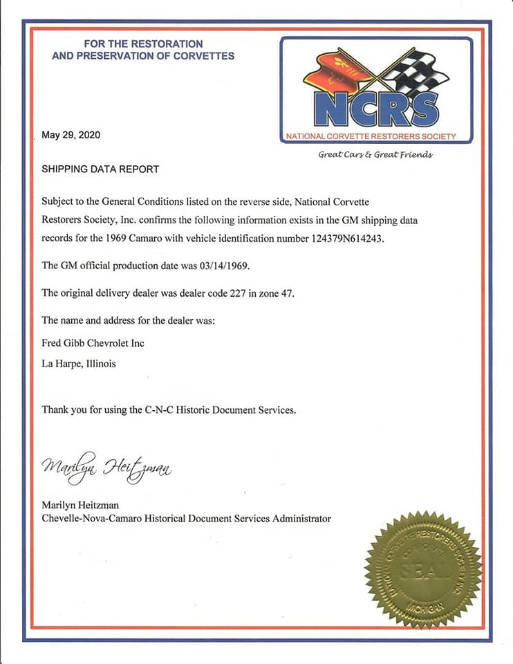 NCRS docs showing Fred Gibb new car delivery, inspected by Larry Christensen (Mr. Camaro) and also Certificate of Authenticity price 78,500 located in az call 480 343 9292