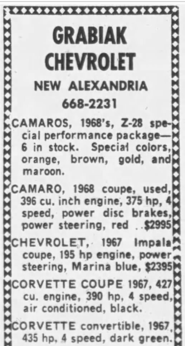 Its is a shame what C Harper did to the old Grabiak Chevrolet. They sold alot of hi performance Chevys. I know of several LS6 Chevelles, LS6 Vette, Z28s, Big block midyears, Fuelie straight axle and midyear vettes, LT1 vettes.