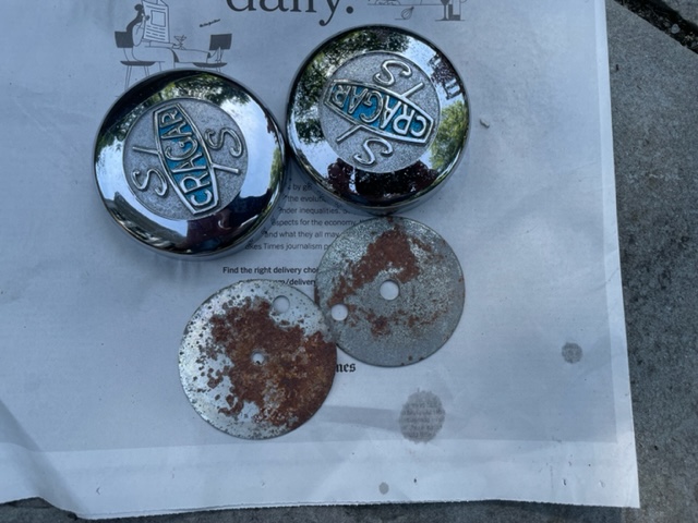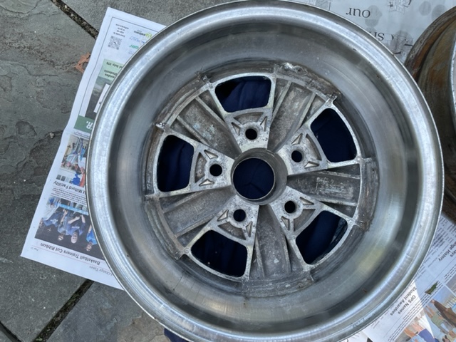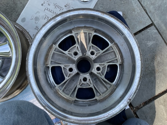 4 3/4 pattern. Look at pics, not perfect for sure. Usual problems, peeling chrome on centers, some rust, curb rash and damage from tire mounting. Different diameter valve stems. Centers not broken from tire mounting. $475.00 plus ship. Can provide more detailed pics to email or phone. Any other stuff I have listed recently, offers are welcome.