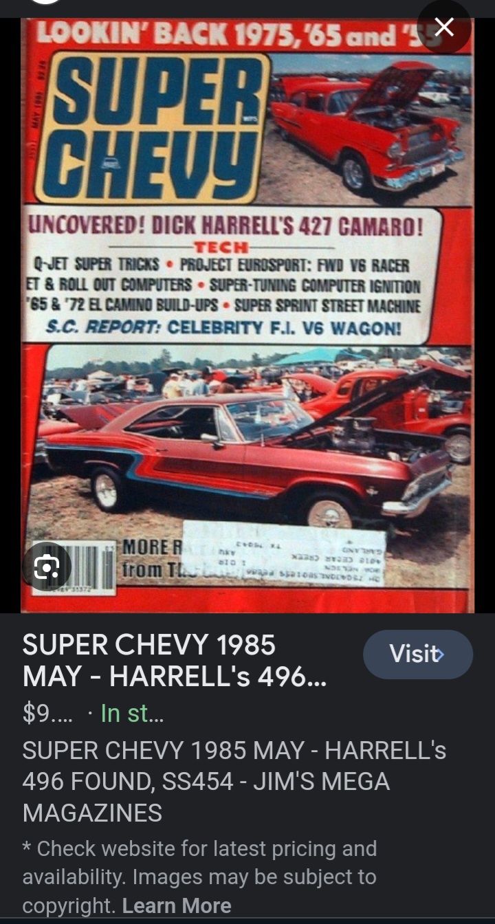 Hi everyone I used to see that car driving around El Paso a man named Charlie Royal bought it new with the original motor on the side and a spare motor he would take it to the drag here in El Paso Texas and race it had the original window sticker on the car a friend of mine named Mike lightburn had been trying to buy the car from Mr Royal for a long time finally he got Mr Royal to sell it and Delmar McAfee bought it through Mike