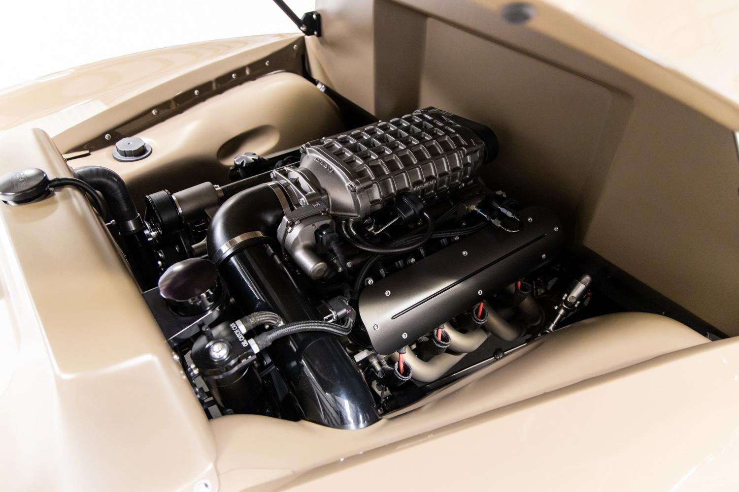 The painted engine compartment is highly detailed throughout. The hood has custom brackets and pumps. To optimize engine set back within the chassis, the firewall was recessed 3” and was smoothed out. It's powered by a Chevrolet Performance LS3 with Magnuson supercharger. It was dyno tested with 632 horsepower and 775 lb-ft at the rear wheels. Olds Rocket valve covers dress up the LS3 and the accessory drive is from Drive Junky. A combination of satin clear on the under hood sheet metal and custom Graphite Gray on the valve covers, supercharger and wheels provide nice contrast to the brown body paint. The front section of the passenger side was modified to conceal the supercharger fluid tank and the driver side now accommodates the cold-air induction tube. The engine is cooled by an aluminum radiator with electric fan which is covered by a custom radiator support panel. The engine breathes through Speed Engineering headers and Flowmaster mufflers with electric exhaust cut outs. The engine is coupled to Chevrolet Performance 4L75E automatic transmission and Currie 9” rear end with 3.73 gears.