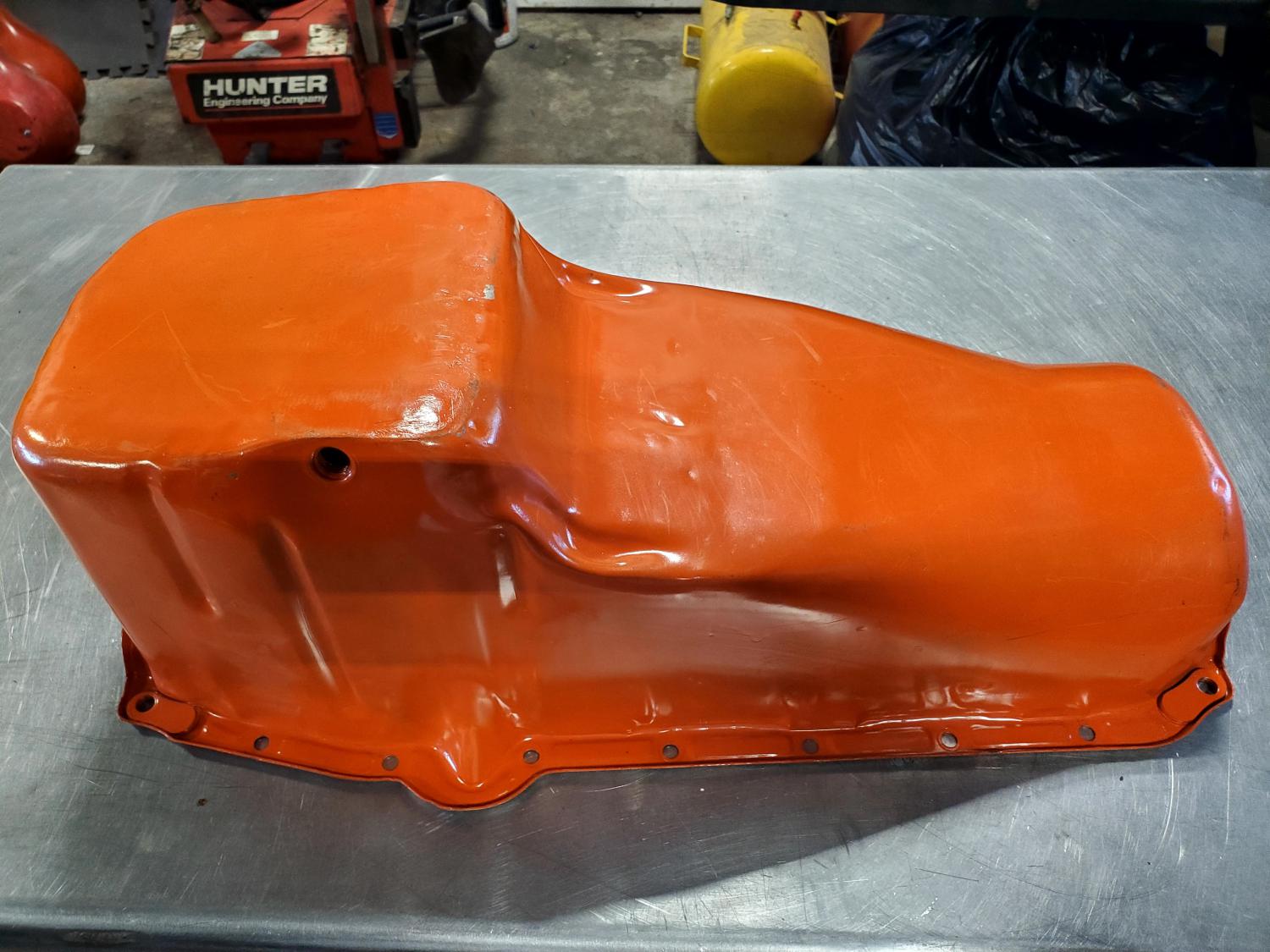 Super clean pan with 2.25" measurement to center of timing cover front flange on pan. (Look closely at 1/8" hashmarks on tape measure)
