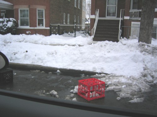 This is what most people do when they spend an hour digging out a spot on the street to park in. They use crates, chairs, etc. to save their spot. All I can say is DON"T be the guy that steals their spot! You will probably come out to see your car windows busted out or tires slashed! ![]() Thank god I own the building or I would be out on the street as well where your car is at serious risk of getting hit by a car or plow truck in this mess! ![]()