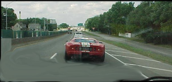 Was at a party last night and one of the officials of the up coming Shelby meet here in Tulsa was there and I told him about seeing the new Shelby GT40. He said it will be at the show but there was only one in existance so far and he doubted that I really knew what I was talking about. He was sure that it was not here yet for the show! Kinda hurt my feelings. I have personally owned a Shelby 500 and 4 Panteras not to mention a couple of dozen Mach I mustangs back when I was a used car dealer. I am a racing fan of these cars and would love to own one of the originals. I was excited when I saw that they were going to make a new car verison of them. So when this came pulling in as I was leaving I had to double back to look it over. Just as I went to try to get my camera the driver came back out and drove off. I asked him if it was the new one that Ford was coming out with and he said it was. There was no dealer paper tag or anything on it to ID the owner. It was obvious that this was a NEW car and not some streetable old race car. It might be a clone but if it is it is sure is a good one. I told him it had a chrome plate on the back where the tag goes that said "Ford Racing" under a blue Ford oval emblem. Sure pissed me off that he thought I didn't know what I was talking about. Then today at Noon, the same red car comes driving by me again and got on the interstate. Took a while for me to catch up but here are a few pic of the dam thing that he said didn't exist in "Tulsa" this week. Wish I could see his face when he sees these pic. Wonder what his coment will be then???? It Sure was hard to keep up with as the driver just didn't want to be passed by a old junky dodge van till he saw that I was trying to take pic of the car. Sorry they are not very good. I was by myself and these are one hand shots out the window at 70mph with everybody around me trying to get a look at it too. Pantera Pic 1