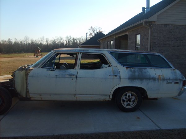 Here is my new project for 08. Its a 69 Chevelle Concours Wagon. Options include, Factory Air, PS,PDB, 12 bolt Rear and 2-way tailgate. Pretty solid old car you can see in the pics it has what is left of the original paint. Factory Butternut Yellow with Black Interior. Plans are to build a 355,with a 700R4 and 3:55 12 bolt posi. Planning on putting in a Tilt Column and reinstalling the factory air.
