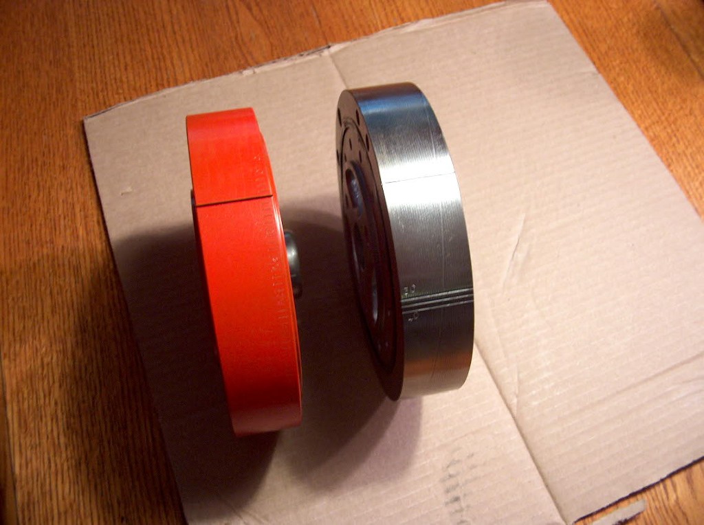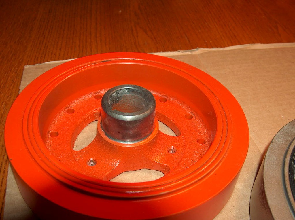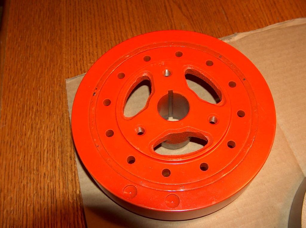 NOS. It has been engraved with a timing scale, and then painted chevy orange. I did not engrave or paint it, so I can't tell you which brand of paint. You can see the engraving if you look closely. I am selling the painted one only. The other one is not for sale.