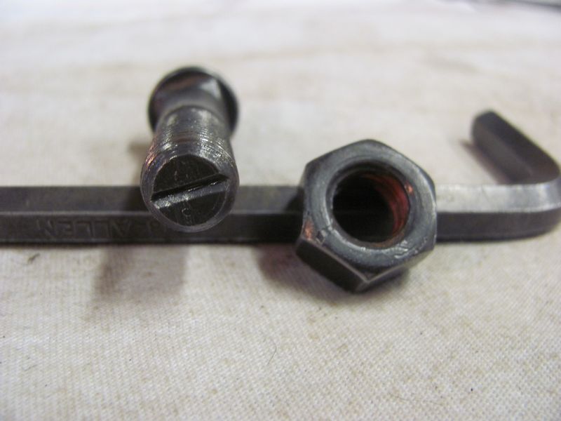 REALLY nice lower steering column shaft clamp carriage bolt and lock nut. WB headmarking and indent on the threaded end. Very few pits on the shoulder.
