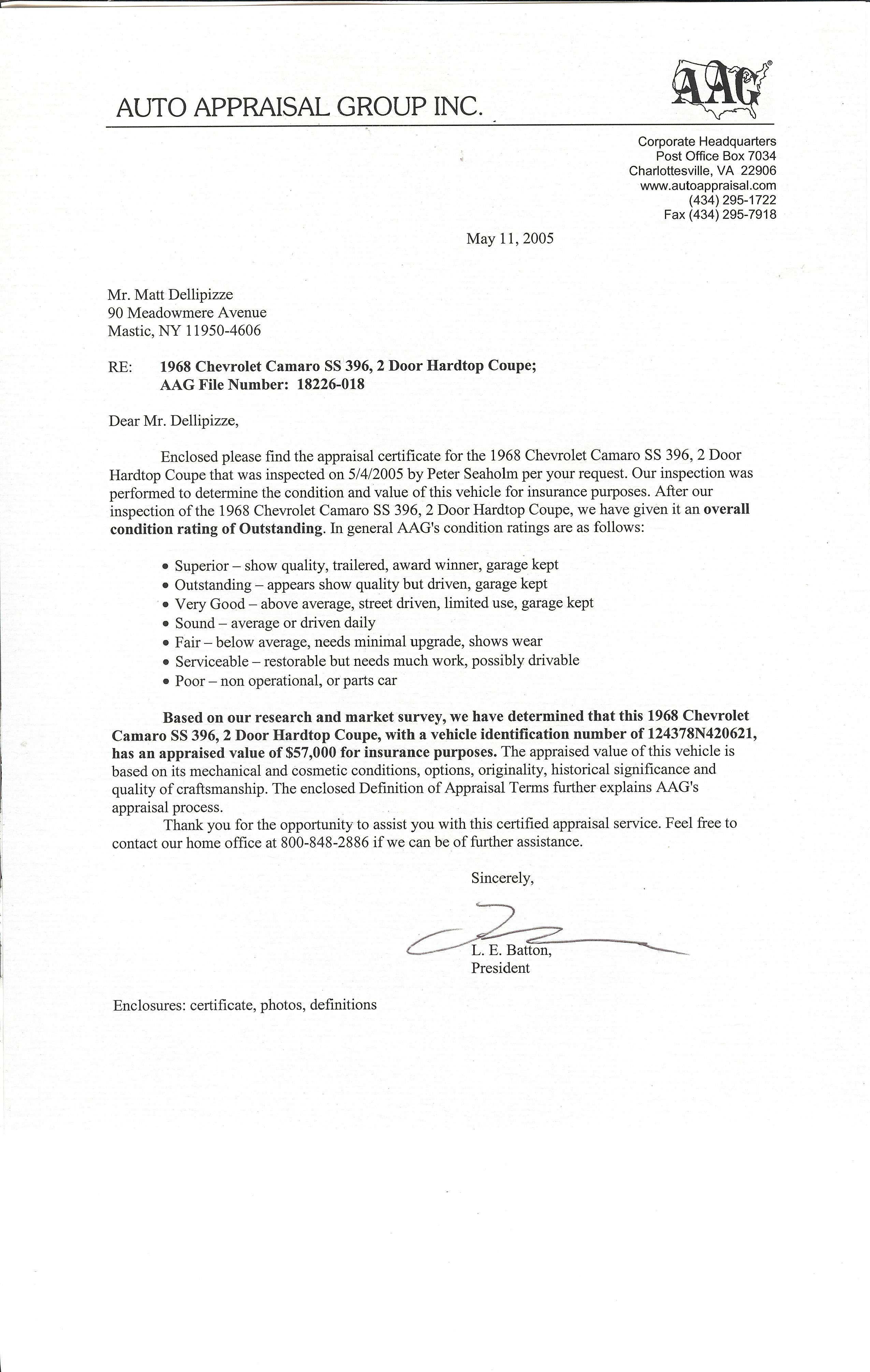 $48,500 1968 396/325 SS Camaro 40,399 actual miles-. vin # 124378N20621 Matador red / black vinyl roof SS camaro was Rotisserie restored by Charles Mulholland of Vineland NJ who specializes in A bodies. Appraised by Larry Batton owner Auto Appraisal Group in May 2005. The car was put through the Mecum auction in May 2005 and purchased by a NE Colorado collector. I purchased this car from his collection on May 5th 2008 with 40120 actual miles. Covered and stored in my heated garage . in the 7 1/2 years I sent the voltage regulator away to be rebuilt, had the clock fixed, and a new battery. Paint and body are exceptional All parts original and operating correctly.