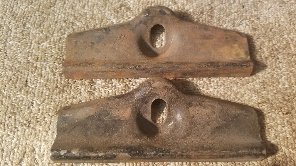 Two very nice original no crimp battery hold down clamps. Still retain most of their paint perfect for survivors no rust or pitting on either one. Both have the arrowhead Insignia. They don't reproduce these with the arrowhead insignia. $40 each shipped to the lower 48. These were phased in sometime during 1970.