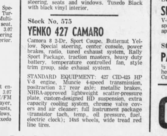 Earl Davis ad including a Yenko Stinger and Yenko Camaro. I wonder if there are records for these two vehicles?