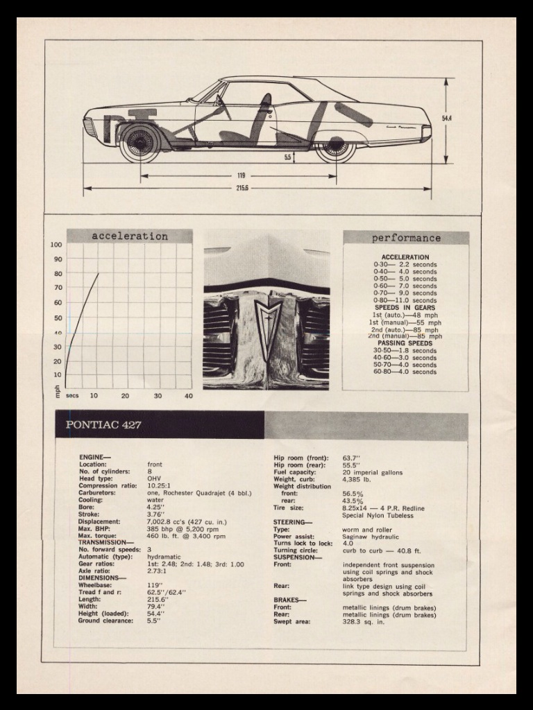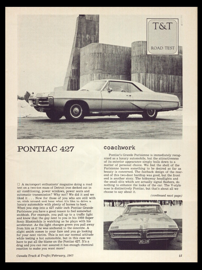 I like 67's best w/ this year specific hideaway nose style also because they didn't share the '68 GP's uncomfortable tail styling. Gold w/ the Stick sure goes nicely w/ the whole Hurst thing too, just add Linda and what more could a fella need! ![]() ![]() Check out this 02/67 Track&Traffic article on the Grande Parisienne version we got here in Canada...w/ Chevy L36/M40! As regular Chevy's, no L72 for '67 and L36 as good as it gets although a different gear choice for the test car would've been nice. ![]() ~ Pete .