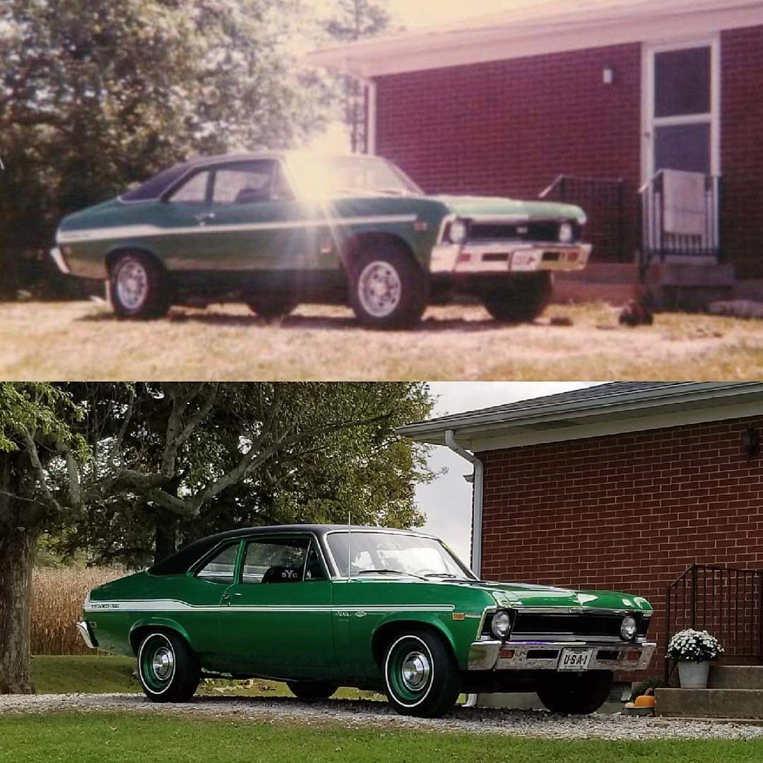 The 1969 VV cook Nova returned home to Laconia Indiana over the weekend for a brief visit. it lived in that area up until 1990 when it was purchased and taken out of state. This picture is the same car in front of the same house taken 40 years apart.