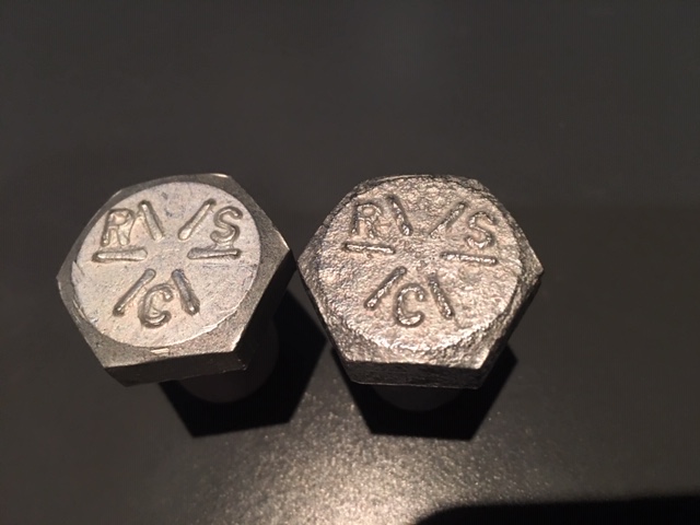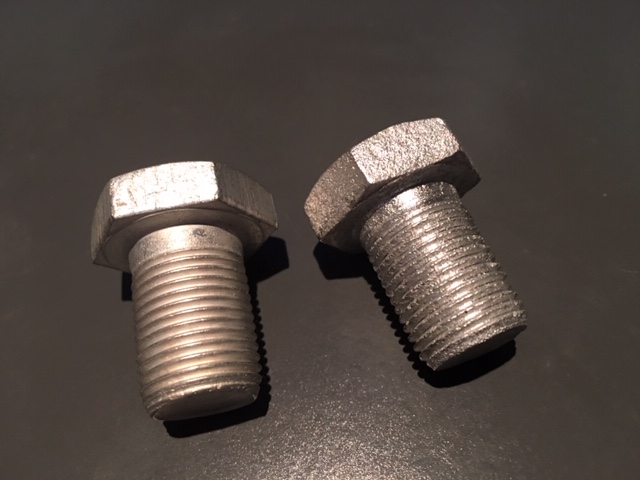 GM parts, cleaned and white cad plated, mounting bolt for the disc brake caliper bracket to the spindle. $40 shipped to the lower 48.