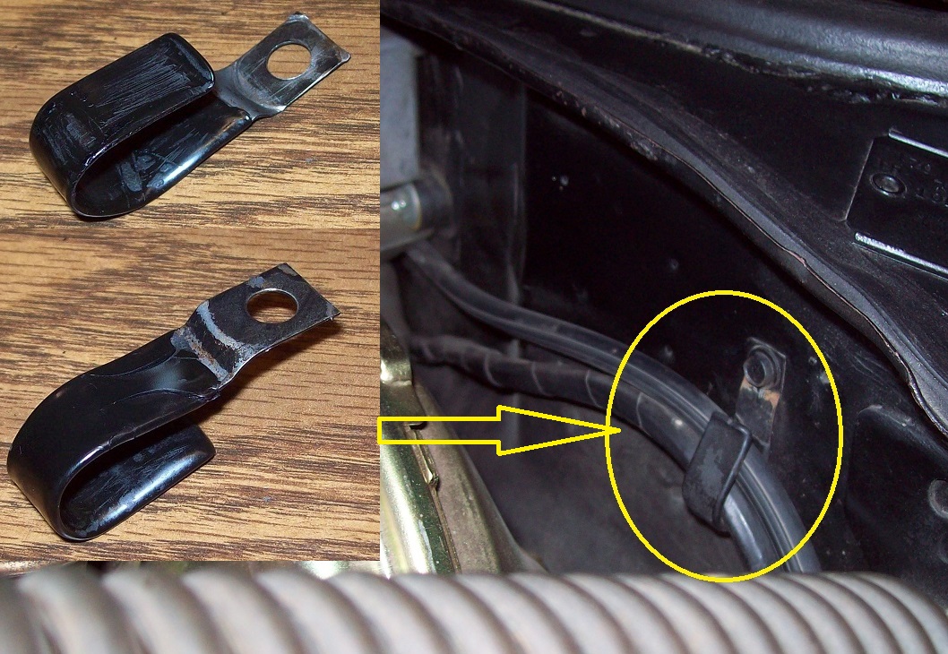 New pick up of the day, the larger J-Clip bracket that screws onto the firewall behind the Brake booster assembly, It holds the Washer motor rubber hose line and wiring harness behind the booster. An unrestored Assembly line J-Clip with Valcanized rubber still on it.