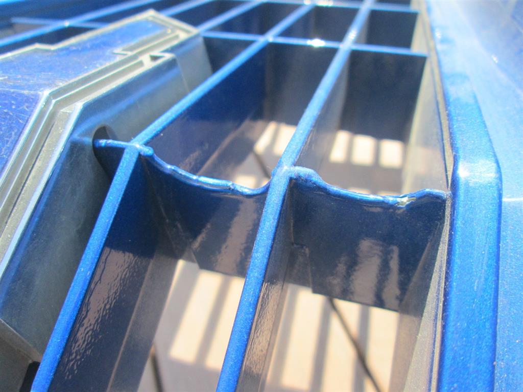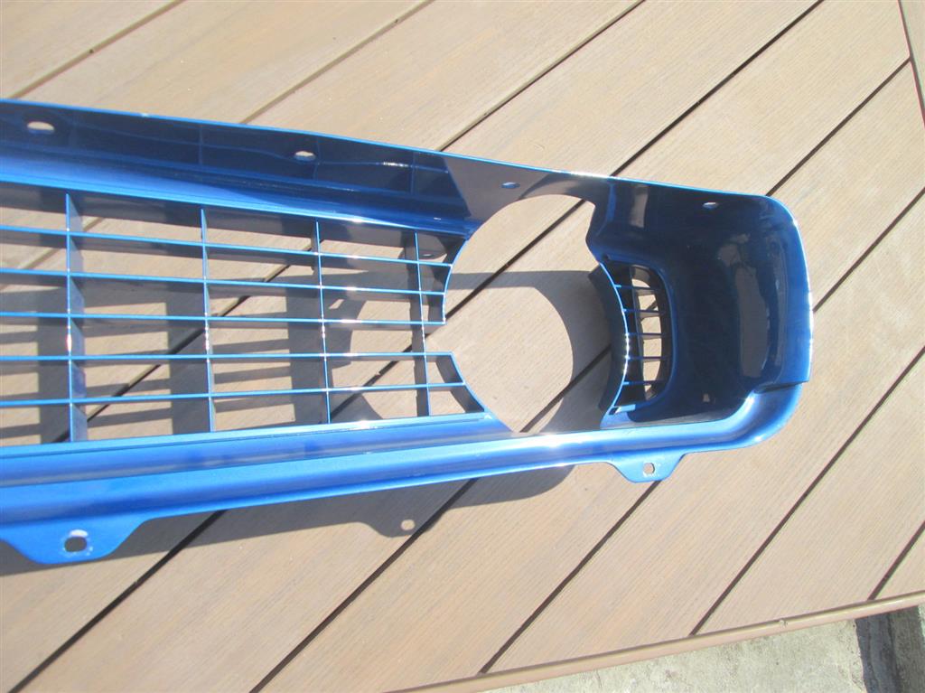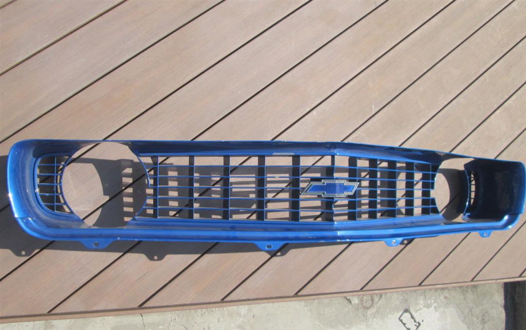Original 69 Camaro original silver grill. This is the production line silver grill that is molded with bone color plastic. This grill has a few chipped vertical dividers at the center as shown. It also has a hairline crack at the top center. Finally, someone painted the whole thing blue at some point as shown. The grill will need to be stripped and have the minor repairs done and will be an awesome original grill.