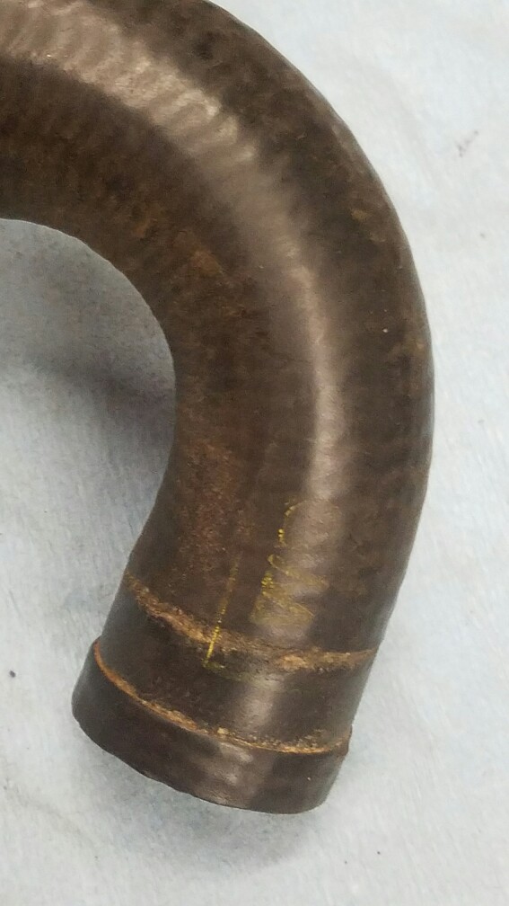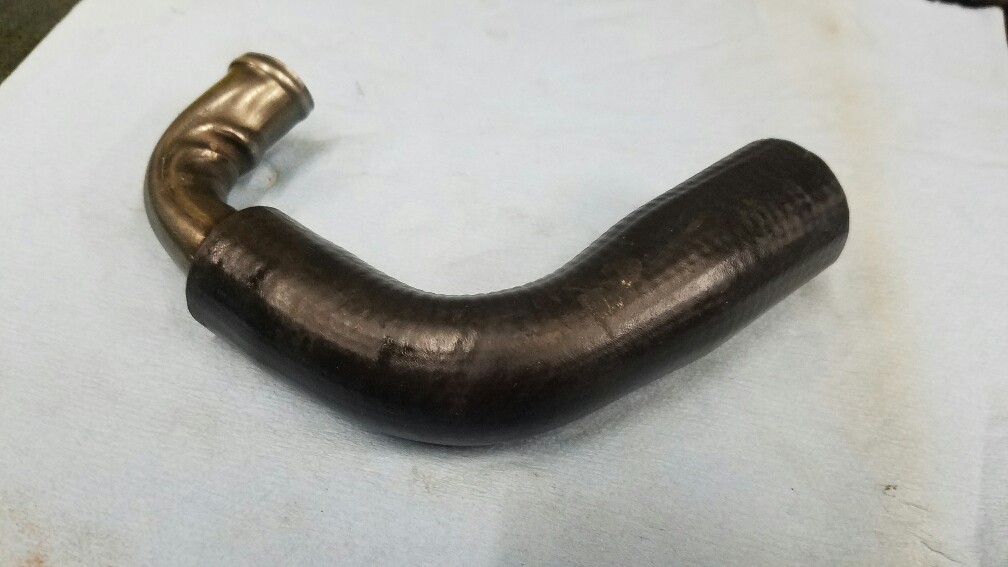 My last one until I go out and find some more. Extremely nice alligator skin high performance small block water pump bypass hose. Extremely nice very flexible and pliable no cracks. On the one end of very little corner was tucked in when it was clamped but it will still seal perfectly as you can see the side screw clamp Impressions above it. $40