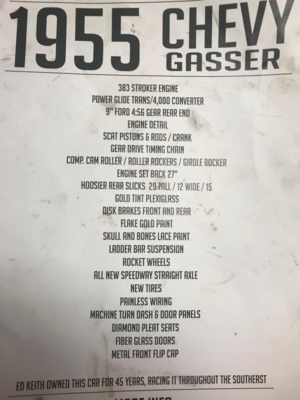 The seller's text from his posts: "1955 gasser ive had this for a bit,but i need to thin some of my toys 383 stroker powerglide unknown miles.......runs high 10s on race gas, i got it after my stroke so i have no race slips on this but it will definitely burn up a road....i have driven it to many gatherings ive driven it maybe 65 miles furthest ive gone it drives very well for a gasser if it is a bad road it drives bad decent road drives pretty good not for women or children 9 " posi rear 4 linked has been a gasser since 1962 has no issues nothing i own has issues i know some like to poke fun at me but i take alot of pride in the cars i build fix and or sell, i dont sell nothing that i wouldn't sell my mom....832-309-4791 i did not build this car but i have work on it all over located just south of kemah)" "its a 55 no emissions it has all lights it does not have windshield wipers i can get it passed here where there are lots of hotrodders who do not run windshield wipers, i do not drive it on a day it may rain,mostly cause i ran slicks on it 1st year i had it,it now has mickey street et's" "it does not have the hoosiers on it no longer" |