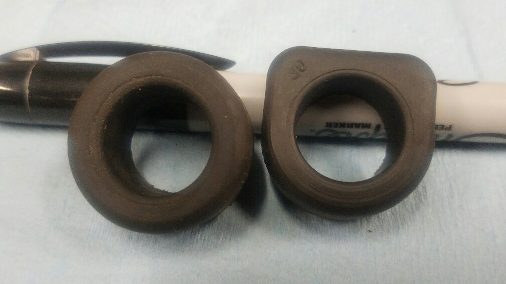 68 through 72 small block steel valve cover rubber grommets. Including 68 Z28 and l79 and all 69 up steel valve covers. The angled valve cover grommet has a concentric ring around it and GF embossed on it. The other valve cover grommet has a concentric ring on the top and AB 131 embossed on the bottom with mold release marks. Excellent original pieces. $35 for the pair ppff.