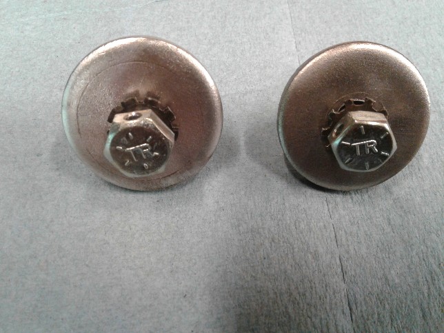 Excellent original restored High Performance Small Block crankshaft balancer mounting bolts with safety wire hole. TR head marking. External toothed star washers have the flat ends not pointed. Very nice original pieces. $45 each. Ppff (X)