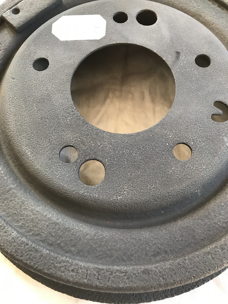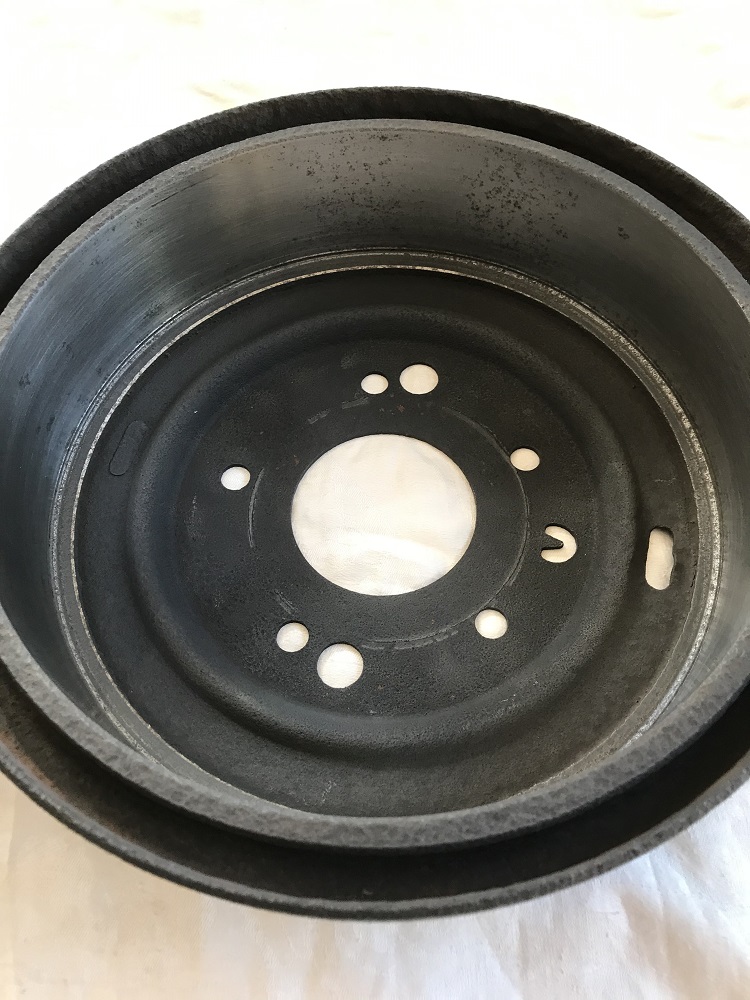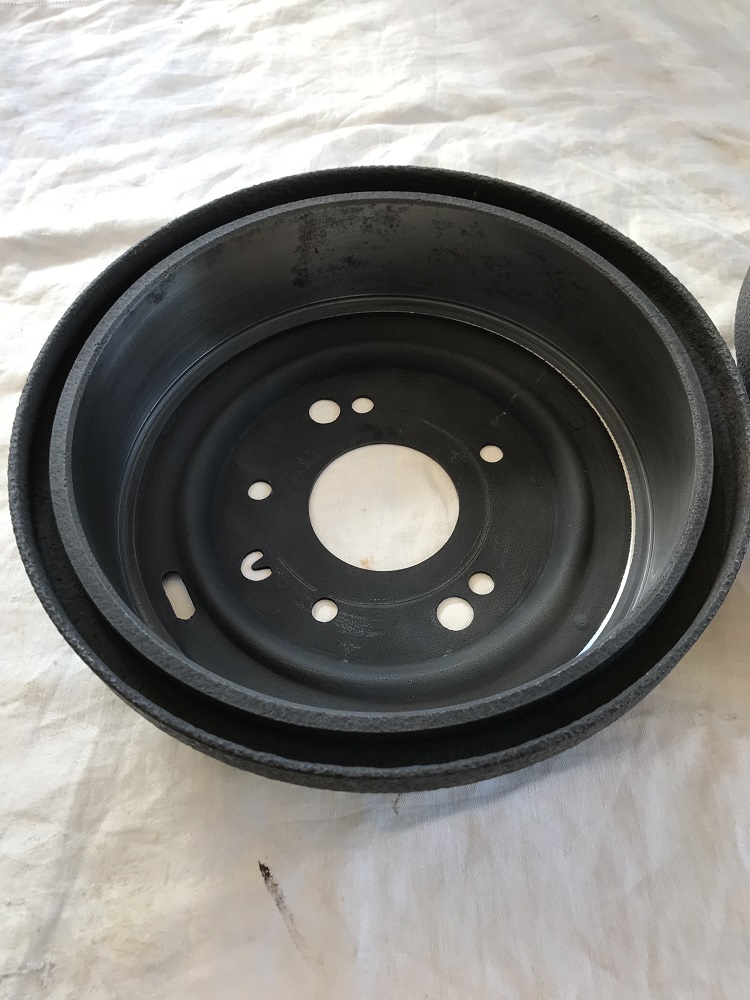 Original casting #3841177 rear brake drums. 9 1/2 x 2. One measures 9.565 and the other 9.568. Still within factory specs. I had these machined a couple of years ago after having them media blasted then primered. The machined surface developed some surface rust in spots. I sanded the surface with 220 grit paper. Cleaned up nice but you can still see were the rust formed. Can install as is or machine another 5 or 10 thousands. Can still read the casting #s. $175.00 plus shipping. F and F paypal please. Jim.