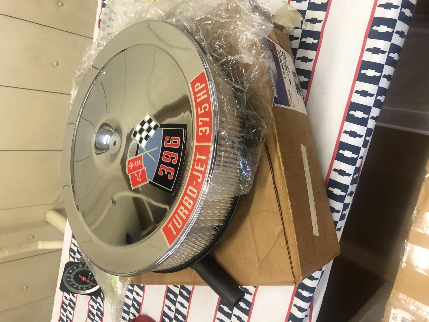Perfect over the counter GM chrome air cleaner. 396 decals added, comes complete with NOS GM valve cover elbow and lower hose to attach. Real deal GM part, including AC 212CW filter. No silkscreen as this is an over the counter piece. Correct for many Chevy applications, complete in the original GM delco box! Ready to bolt on. $450 complete. Buyer pays shipping, PayPal ready.