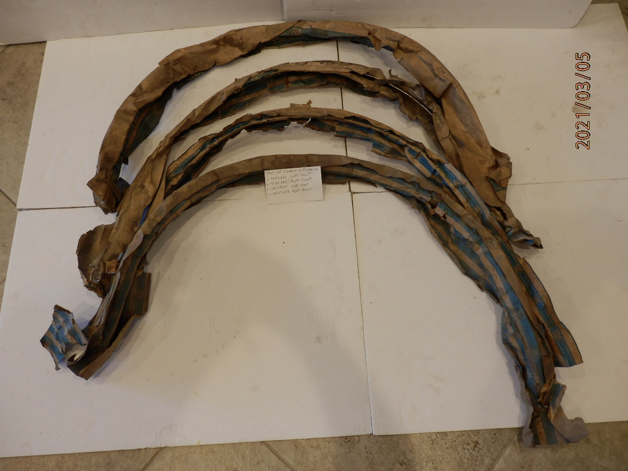 I also have 2 pair of 1968 quarter panels & 2 pair of 67-68 rear outer wheel house's, I will have these at Spring Carlisle, stop by space's E76-77 April 21-24. I can ship the wheel open's moldings & header panel or I can deliver to Carlisle for free if paid in advance. 3 sets of 1967-68 Camaro & Firebird Std wheel opening moldings, these have been in dry storage for over 40 years, still in original GM wrappers, & no I am not taking them out of the wrapper to see, I will guarantee these not to be bent & not usable. I now have them wrapped in shrink wrap to preserve & send. 1-9785880 left front 1-9785881 right front 1-4229494 left rear 1-4229493 right rear 1-set $649 + shipping 1 set of 1968 Rally Sport Only 1-9785880 left front 1-9785881 right front 1-7795064 left rear 1-7795063 right rear $799 + shipping SOLD 1-1967-68 Camaro Front Header Panel GM 3927907 in Old white box dated 6/78 $349 SOLD Last edited by 69L78; 03-12-2021 at 09:25 AM. Reason: Lower price |