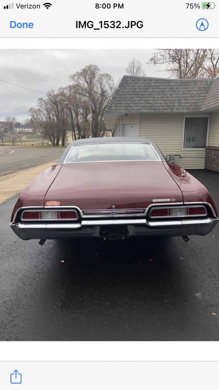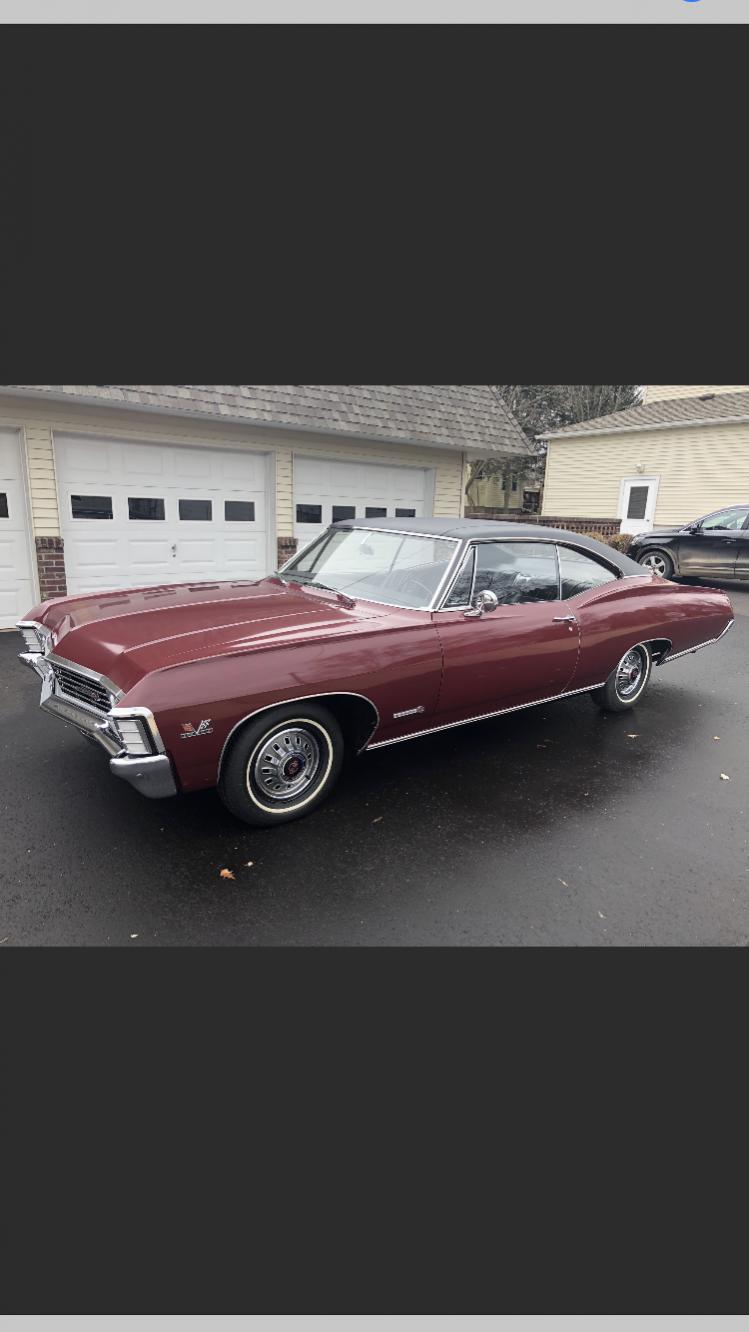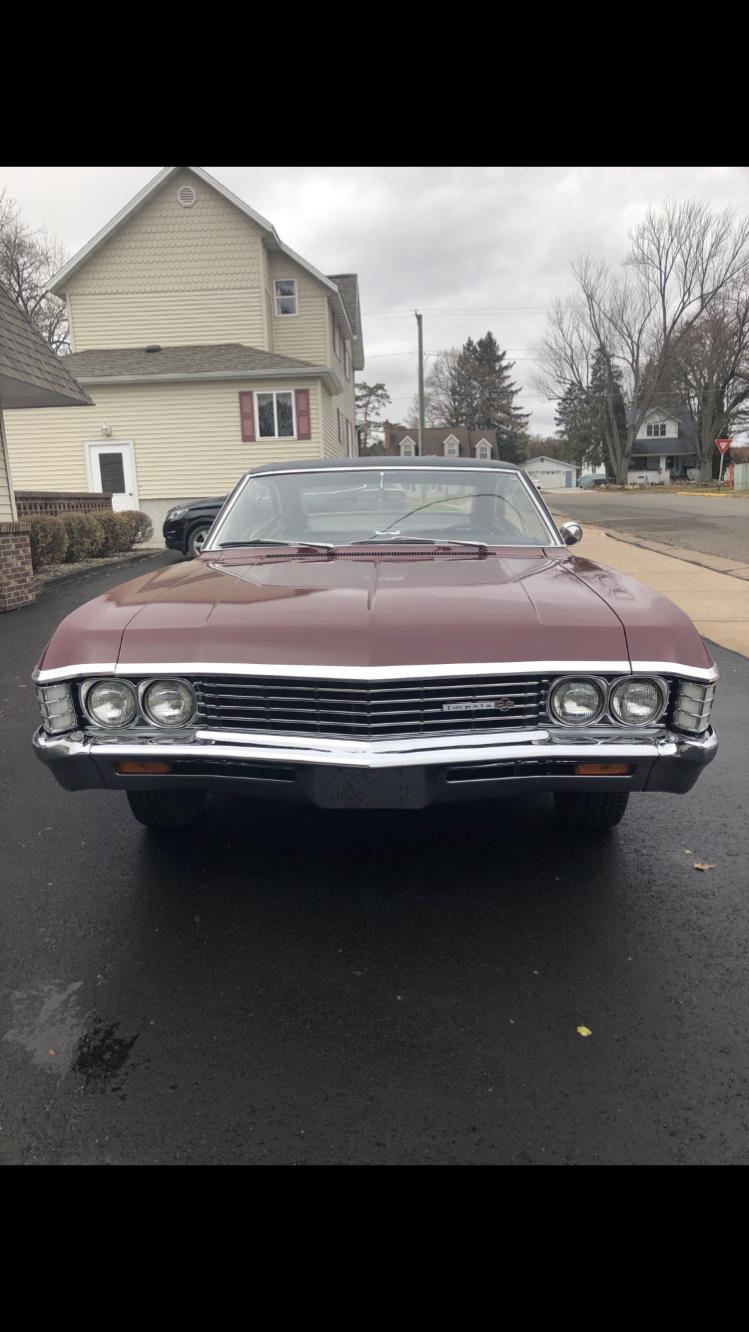 1967 Impala SS 396, madiera maroon, blk. vinyl top, blk. interior, 16,891 act. miles, M-21 4sp. console, 3.55 12 bolt posi. rear, F-41 H.D. suspension, factory tach. and gauges, documented unrestored survivor. $42,000 PH: 715-748-3953 Jeff Wi.