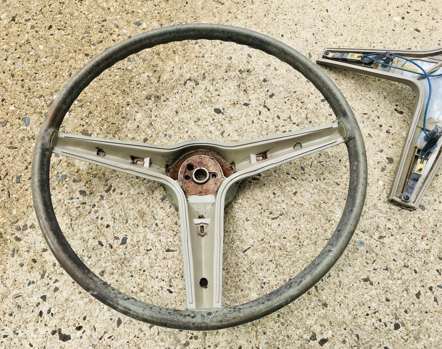 This is an original deluxe steering wheel that came out of a GTO. It is correct for any 1969-72 Pontiac. It needs to be cleaned/restored but is complete with center trim, horn buttons, & wiring. $20 plus shipping.