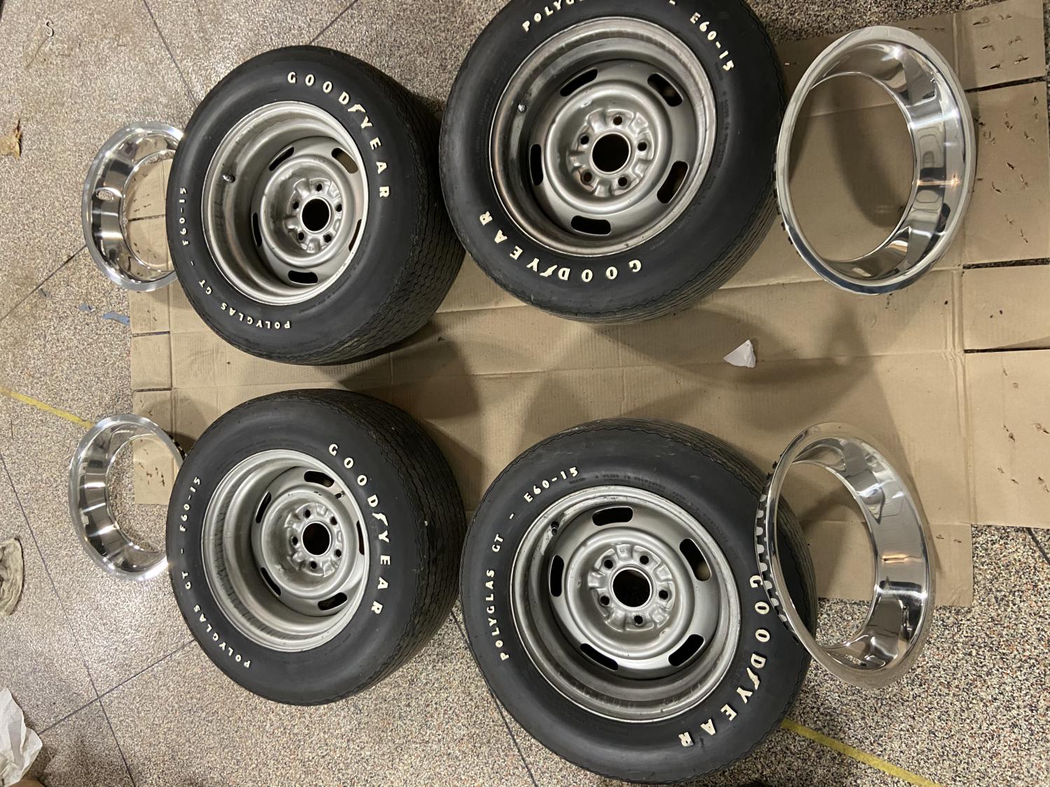 All 4 wheels are Corvette 15x8 Rally’s with Goodyear Polyglas GT E60-15 2 are coded AZ 2 are dated Feb 1968 coded AG I got these on a 69 Z that I bought and have no use for them. They also come with trim rings. $500 takes all.