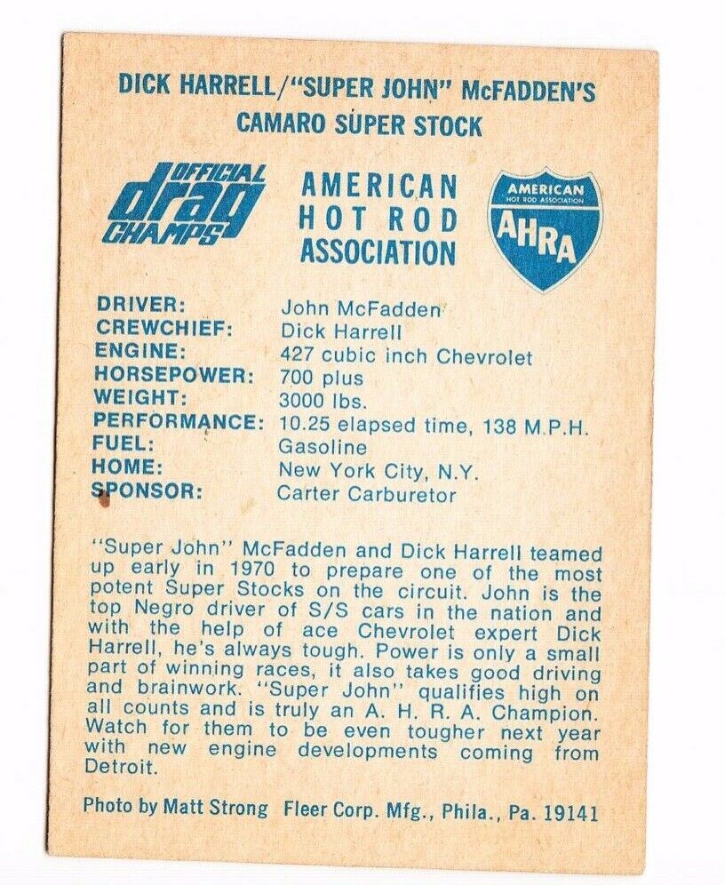 The Super John Camaro was built as a light weight Camaro with gutted front end , fiberglass nose, no front brakes, used a drag chute, 2x4BB Tunnel Ram. They ran in AHRA SS/E or match race trim. The AHRA SS/E (not the same as NHRA SS/E) cars and match race cars were very fast and popular and became Pro Stock in 1970. From what I can tell, DH set up the Super John Camaro and ZL-1 #1 , #15 , and #29 as light weight SS/E or match race Camaros. DH may have built others because these were popular match race money makers. The ZL-1s that ran in NHRA were set up different. |