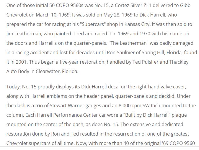 It was the car in the 1/4 Million 1/4 mile race. I posted that another site claimed it was "an 'original' COPO' All-Aluminum 427 that ran NHRA SS/C." So was it a COPO or not? Is it around today??