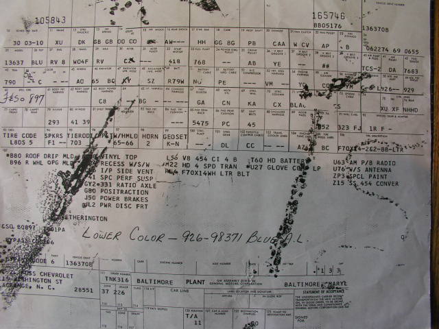 I have been searching for information on the paint code on my 68 Chevelle SS396 convertible. It was built in Baltimore and sold in NC. The paint code on the trim tag shows 2393-2 where the paint code should show a letter. It has a black top as it should. I know I am reading the tag correctly. Could someone please try and shed some light on this code. I have searched unsuccessfully for a build sheet. I found a small area of original paint (car was redone in the 90's) and it is a sky blue called Carolina Blue, available only in North and South Carolina. Please help!!!