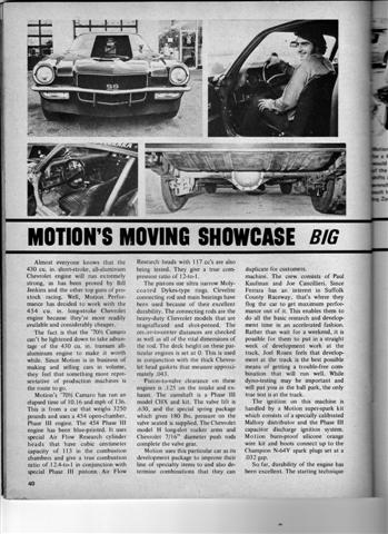 I remember a gloomy fall afternoon watching 2 '69 Motion Camaro's coming out of the service door. Both cars were 427's one having an era custom green and white flip flop paint job. They were being driven down to North Carolina to the new owners. The mechanics were joking regarding the likelihood of both making the trip unscathed with the big cams & steep gears. I have a bunch of slides from 67-69 at Islip and West Hampton that I need to go through, I know there are some Motion cars in there. I'll need to have some prints made to scan and send in. I'm attaching a picture of the Astoria-Chas vette taken out at Hampton and an article on the Ribbon Camaro I had not seen posted. Thanks again for the GREAT memories!!! |